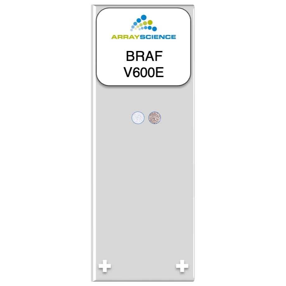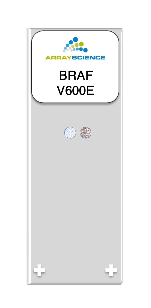 This control array contains a melanoma cell line that shows a BRAF V600E mutation. It can also serve as a control for multiple melanocytic markers, including S-100, Melan A, HMB-45, SOX10, and PRAME, among others. The negative core is a thyroid medullary carcinoma with reactivity for TTF-1, Thyroglobulin, calcitonin, synaptophysin, and villin, among others.